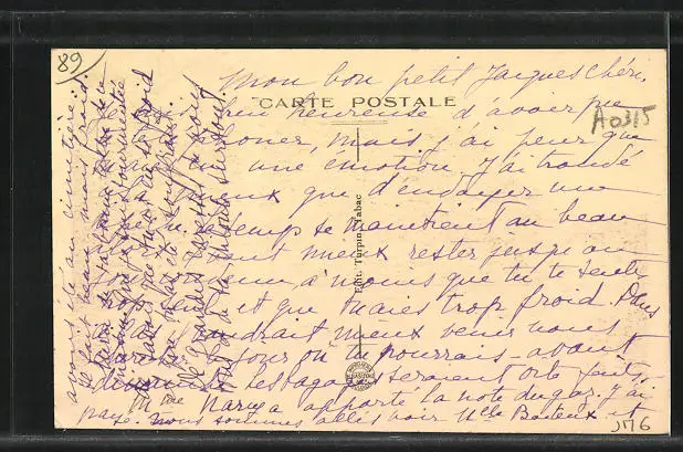Personenbezogene Daten auf der Rückseite der Karte wurden durch blauen Textmarker unkenntlich gemacht. Die blauen Stellen sind auf die Vorderseite durchgeweicht und wirken sich negativ auf das Postkartenfoto aus