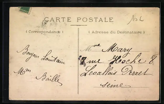 Personenbezogene Daten auf der Rückseite der Karte wurden durch blauen Textmarker unkenntlich gemacht. Die blauen Stellen sind auf die Vorderseite durchgeweicht und wirken sich negativ auf das Postkartenfoto aus