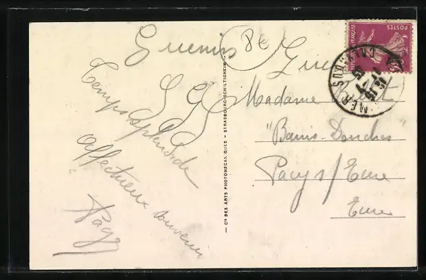 Personenbezogene Daten auf der Rückseite der Karte wurden durch blauen Textmarker unkenntlich gemacht. Die blauen Stellen sind auf die Vorderseite durchgeweicht und wirken sich negativ auf das Postkartenfoto aus
