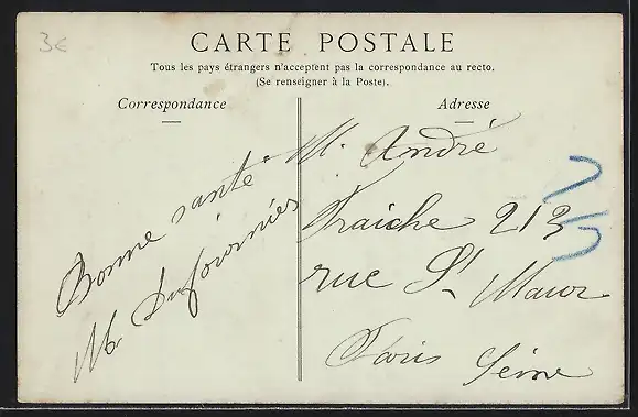 Personenbezogene Daten auf der Rückseite der Karte wurden durch blauen Textmarker unkenntlich gemacht. Die blauen Stellen sind auf die Vorderseite durchgeweicht und wirken sich negativ auf das Postkartenfoto aus