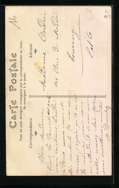 Personenbezogene Daten auf der Rückseite der Karte wurden durch blauen Textmarker unkenntlich gemacht. Die blauen Stellen sind auf die Vorderseite durchgeweicht und wirken sich negativ auf das Postkartenfoto aus