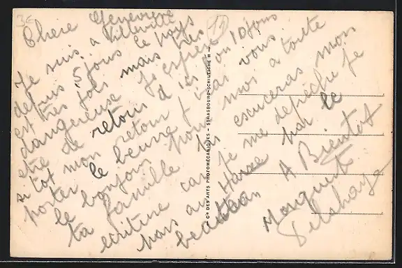 Personenbezogene Daten auf der Rückseite der Karte wurden durch blauen Textmarker unkenntlich gemacht. Die blauen Stellen sind auf die Vorderseite durchgeweicht und wirken sich negativ auf das Postkartenfoto aus