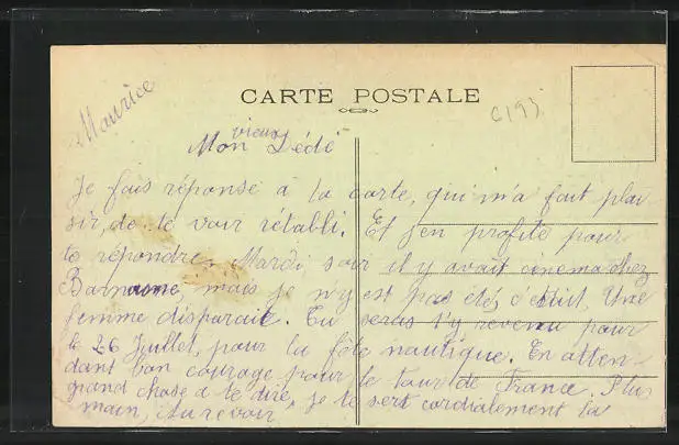 Personenbezogene Daten auf der Rückseite der Karte wurden durch blauen Textmarker unkenntlich gemacht. Die blauen Stellen sind auf die Vorderseite durchgeweicht und wirken sich negativ auf das Postkartenfoto aus
