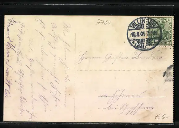 Personenbezogene Daten auf der Rückseite der Karte wurden durch blauen Textmarker unkenntlich gemacht. Die blauen Stellen sind auf die Vorderseite durchgeweicht und wirken sich negativ auf das Postkartenfoto aus