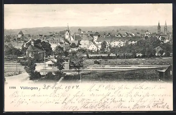 AK Villingen / Baden, Ortsansicht mit Bahnübergang