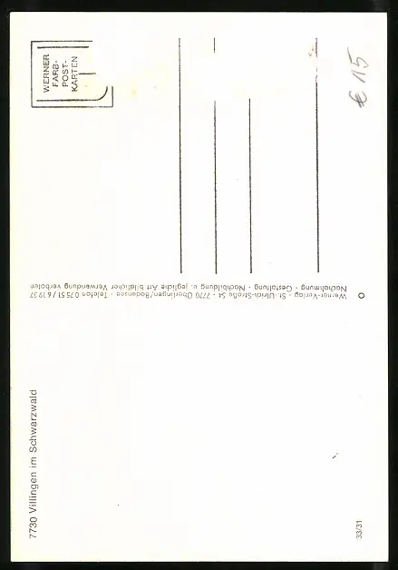 Personenbezogene Daten auf der Rückseite der Karte wurden durch blauen Textmarker unkenntlich gemacht. Die blauen Stellen sind auf die Vorderseite durchgeweicht und wirken sich negativ auf das Postkartenfoto aus