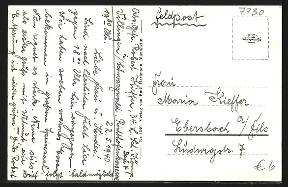 Personenbezogene Daten auf der Rückseite der Karte wurden durch blauen Textmarker unkenntlich gemacht. Die blauen Stellen sind auf die Vorderseite durchgeweicht und wirken sich negativ auf das Postkartenfoto aus