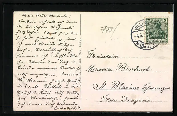 Personenbezogene Daten auf der Rückseite der Karte wurden durch blauen Textmarker unkenntlich gemacht. Die blauen Stellen sind auf die Vorderseite durchgeweicht und wirken sich negativ auf das Postkartenfoto aus