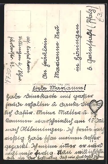 Personenbezogene Daten auf der Rückseite der Karte wurden durch blauen Textmarker unkenntlich gemacht. Die blauen Stellen sind auf die Vorderseite durchgeweicht und wirken sich negativ auf das Postkartenfoto aus