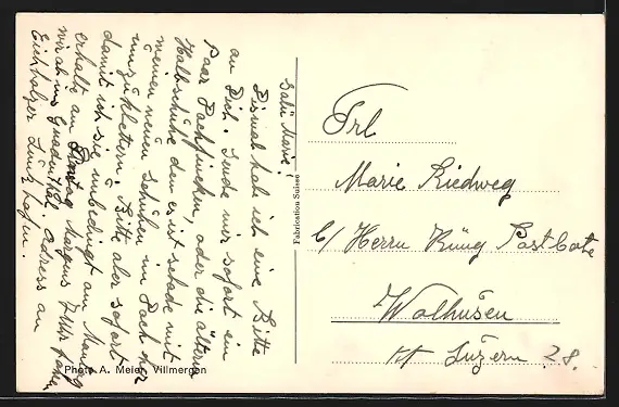 Personenbezogene Daten auf der Rückseite der Karte wurden durch blauen Textmarker unkenntlich gemacht. Die blauen Stellen sind auf die Vorderseite durchgeweicht und wirken sich negativ auf das Postkartenfoto aus