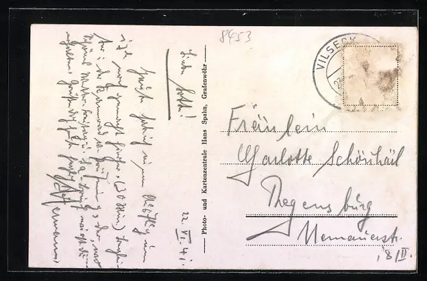 Personenbezogene Daten auf der Rückseite der Karte wurden durch blauen Textmarker unkenntlich gemacht. Die blauen Stellen sind auf die Vorderseite durchgeweicht und wirken sich negativ auf das Postkartenfoto aus