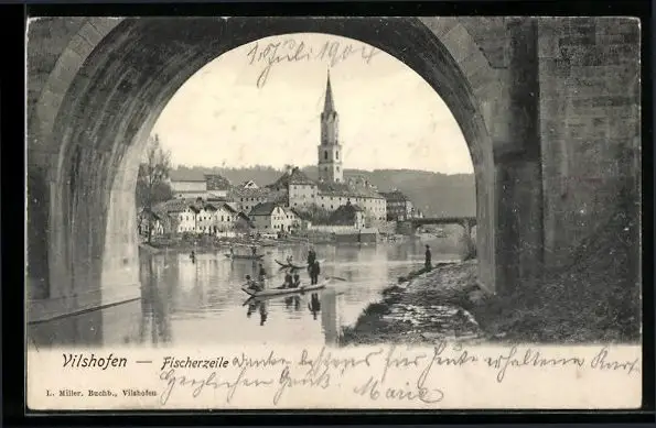 AK Vilshofen, Fischerzeile mit Kirche im Hintergrund