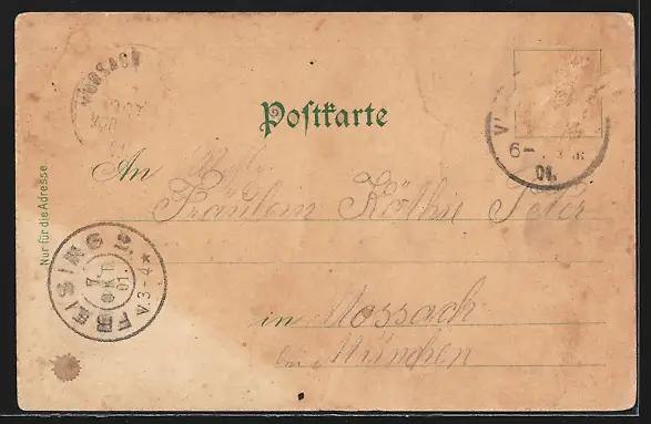 alte Ansichtskarte, gelaufen 1901, Briefmarke entfernt, rückseitig Oberflächenschaden, guter Zustand