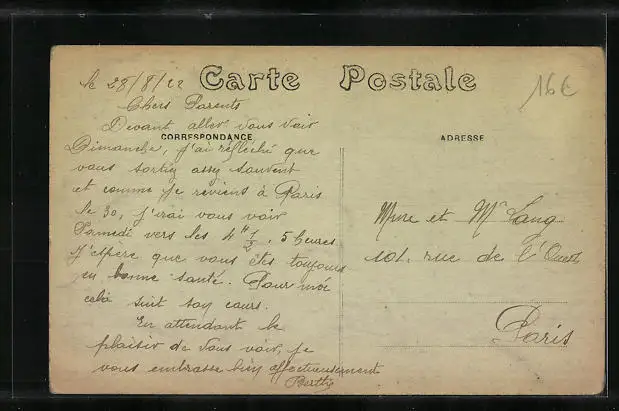 Personenbezogene Daten auf der Rückseite der Karte wurden durch blauen Textmarker unkenntlich gemacht. Die blauen Stellen sind auf die Vorderseite durchgeweicht und wirken sich negativ auf das Postkartenfoto aus