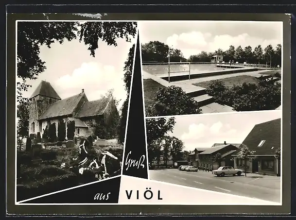 AK Viöl bei Husum, Friedhof und Kirche, das Freibad, Strassenpartie