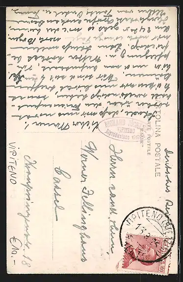 Personenbezogene Daten auf der Rückseite der Karte wurden durch blauen Textmarker unkenntlich gemacht. Die blauen Stellen sind auf die Vorderseite durchgeweicht und wirken sich negativ auf das Postkartenfoto aus