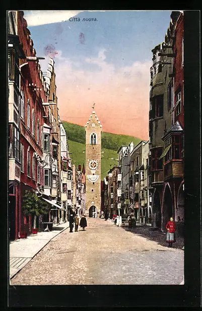 AK Vipiteno, Strassenpartie mit Turm im Abendrot