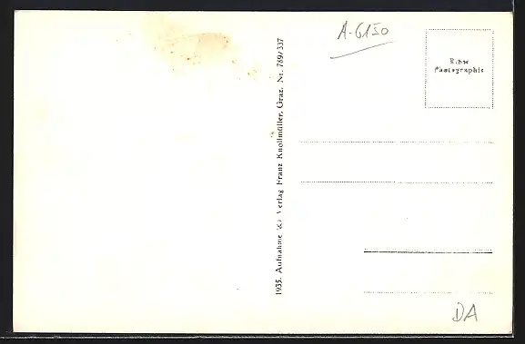 Personenbezogene Daten auf der Rückseite der Karte wurden durch blauen Textmarker unkenntlich gemacht. Die blauen Stellen sind auf die Vorderseite durchgeweicht und wirken sich negativ auf das Postkartenfoto aus