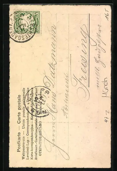 Personenbezogene Daten auf der Rückseite der Karte wurden durch blauen Textmarker unkenntlich gemacht. Die blauen Stellen sind auf die Vorderseite durchgeweicht und wirken sich negativ auf das Postkartenfoto aus
