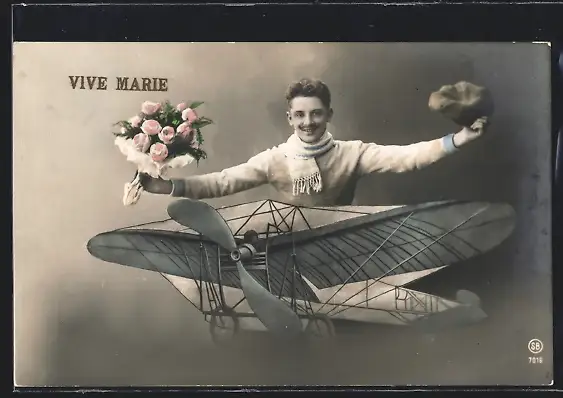 AK Vive Marie, Junger Mann mit Rosen auf einem kleinen Flugzeug