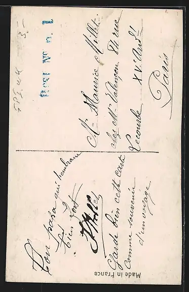 Personenbezogene Daten auf der Rückseite der Karte wurden durch blauen Textmarker unkenntlich gemacht. Die blauen Stellen sind auf die Vorderseite durchgeweicht und wirken sich negativ auf das Postkartenfoto aus