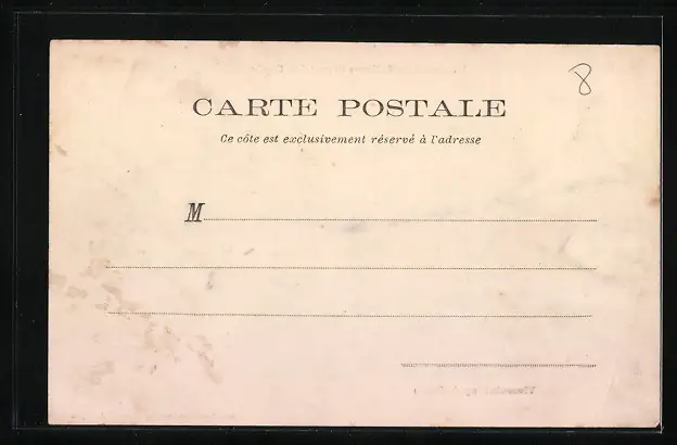 Personenbezogene Daten auf der Rückseite der Karte wurden durch blauen Textmarker unkenntlich gemacht. Die blauen Stellen sind auf die Vorderseite durchgeweicht und wirken sich negativ auf das Postkartenfoto aus