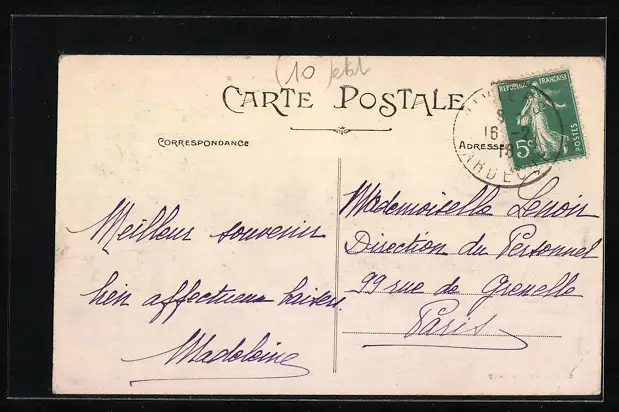 Personenbezogene Daten auf der Rückseite der Karte wurden durch blauen Textmarker unkenntlich gemacht. Die blauen Stellen sind auf die Vorderseite durchgeweicht und wirken sich negativ auf das Postkartenfoto aus
