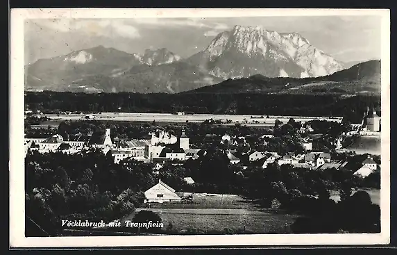 AK Vöcklabruck, Totalansicht mit Kirche und Traunstein