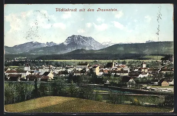 AK Vöcklabruck, Totalansicht mit Kirche und dem Traunstein