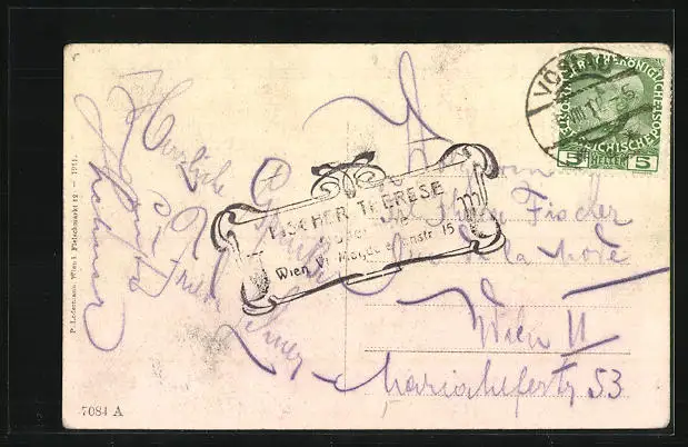 Personenbezogene Daten auf der Rückseite der Karte wurden durch blauen Textmarker unkenntlich gemacht. Die blauen Stellen sind auf die Vorderseite durchgeweicht und wirken sich negativ auf das Postkartenfoto aus