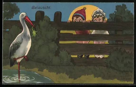 AK Vogel mit einem Frosch wird von Kindern hinterm Zaun belauscht