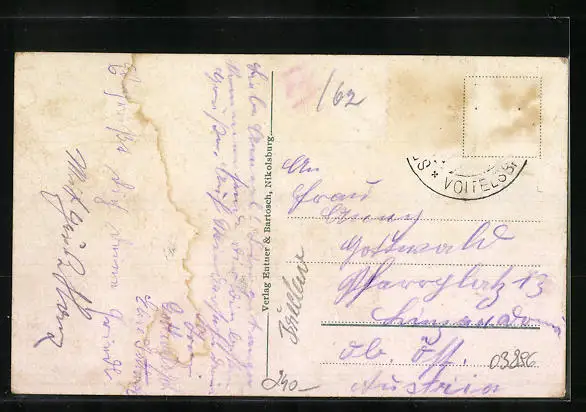 Personenbezogene Daten auf der Rückseite der Karte wurden durch blauen Textmarker unkenntlich gemacht. Die blauen Stellen sind auf die Vorderseite durchgeweicht und wirken sich negativ auf das Postkartenfoto aus