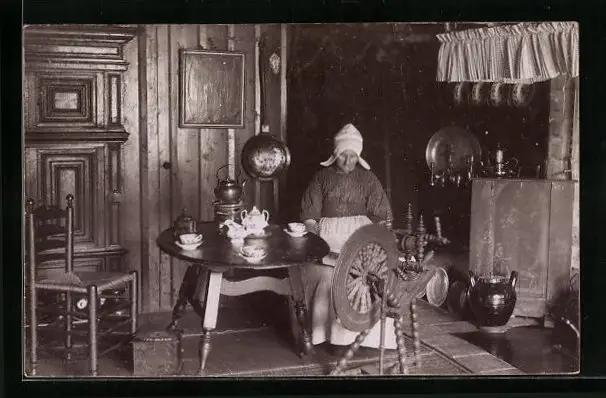 AK Voldenam, Ältere Niederländerin sitzt am Spinnrad