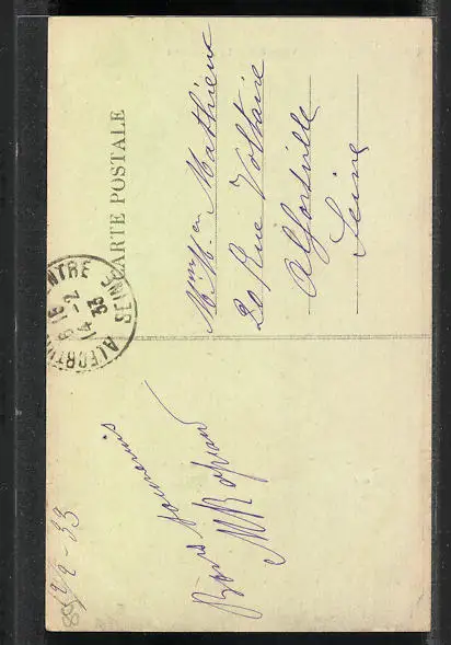 Personenbezogene Daten auf der Rückseite der Karte wurden durch blauen Textmarker unkenntlich gemacht. Die blauen Stellen sind auf die Vorderseite durchgeweicht und wirken sich negativ auf das Postkartenfoto aus
