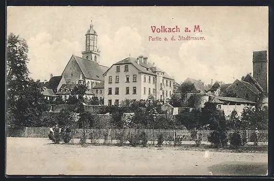 AK Volkach a. M., Partie an der Stadtmauer mit Kirche