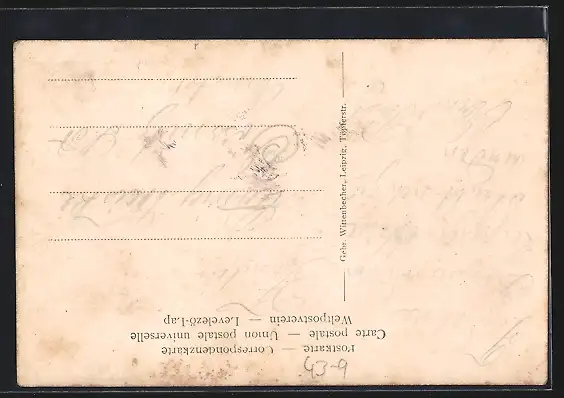 Personenbezogene Daten auf der Rückseite der Karte wurden durch blauen Textmarker unkenntlich gemacht. Die blauen Stellen sind auf die Vorderseite durchgeweicht und wirken sich negativ auf das Postkartenfoto aus