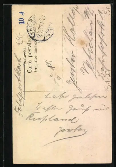Personenbezogene Daten auf der Rückseite der Karte wurden durch blauen Textmarker unkenntlich gemacht. Die blauen Stellen sind auf die Vorderseite durchgeweicht und wirken sich negativ auf das Postkartenfoto aus