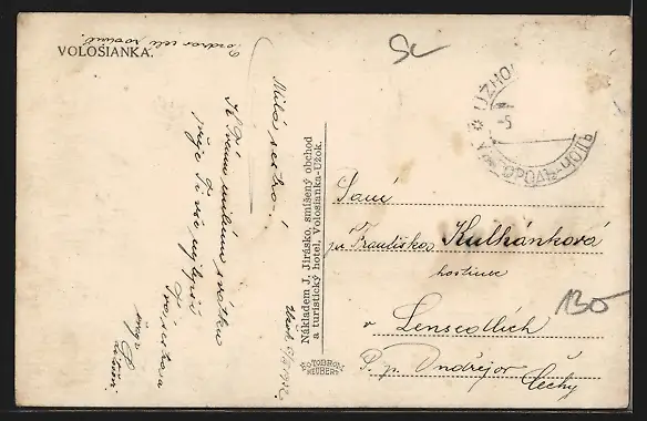 Personenbezogene Daten auf der Rückseite der Karte wurden durch blauen Textmarker unkenntlich gemacht. Die blauen Stellen sind auf die Vorderseite durchgeweicht und wirken sich negativ auf das Postkartenfoto aus