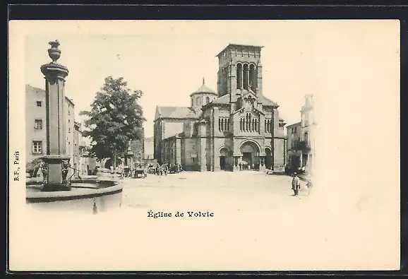 AK Volvic, Église de Volvic et fontaine sur la place centrale