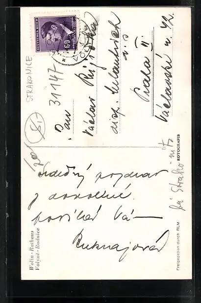 Personenbezogene Daten auf der Rückseite der Karte wurden durch blauen Textmarker unkenntlich gemacht. Die blauen Stellen sind auf die Vorderseite durchgeweicht und wirken sich negativ auf das Postkartenfoto aus