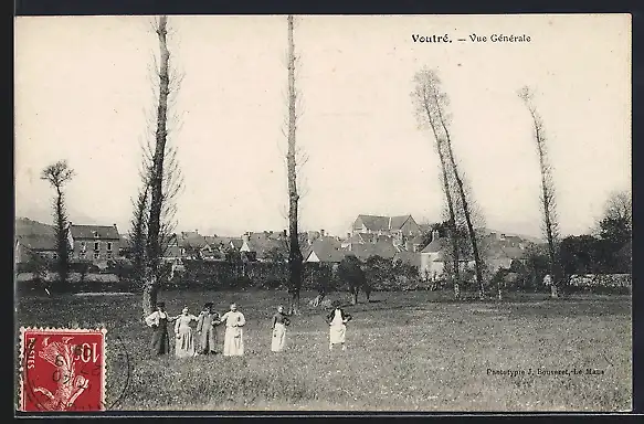 AK Voutré, Vue générale du village avec habitants dans un champ