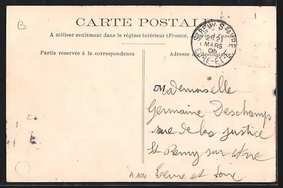 Personenbezogene Daten auf der Rückseite der Karte wurden durch blauen Textmarker unkenntlich gemacht. Die blauen Stellen sind auf die Vorderseite durchgeweicht und wirken sich negativ auf das Postkartenfoto aus