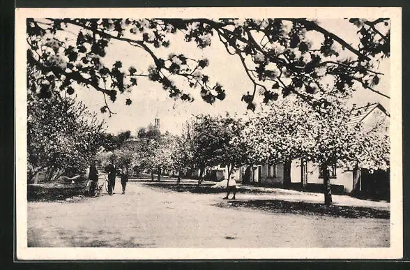 AK Vrbice, Strassenpartie mit Radfahrer, Blick gegen die Kirche