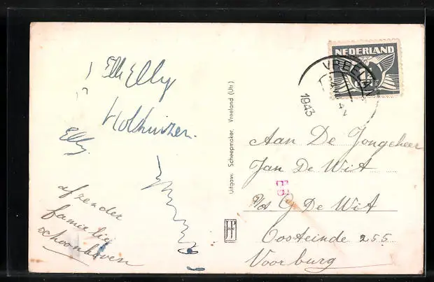 Personenbezogene Daten auf der Rückseite der Karte wurden durch blauen Textmarker unkenntlich gemacht. Die blauen Stellen sind auf die Vorderseite durchgeweicht und wirken sich negativ auf das Postkartenfoto aus