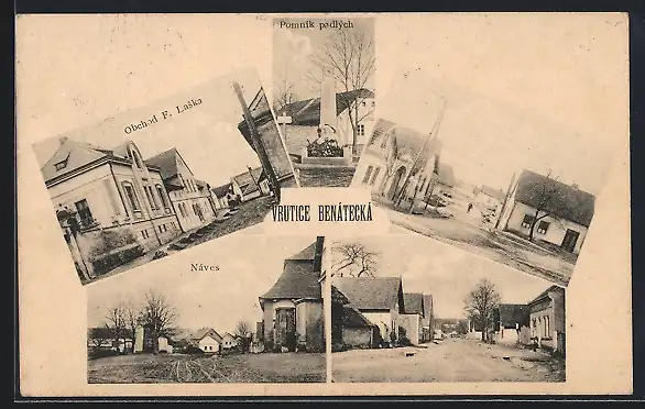 AK Vrutice Benátecká, Obchod F. Laska, Pomník padlých, Náves