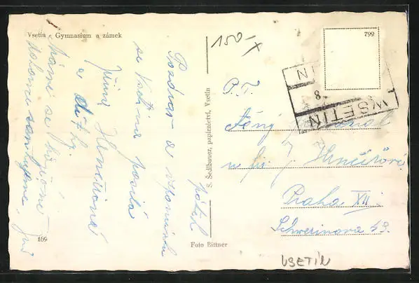 Personenbezogene Daten auf der Rückseite der Karte wurden durch blauen Textmarker unkenntlich gemacht. Die blauen Stellen sind auf die Vorderseite durchgeweicht und wirken sich negativ auf das Postkartenfoto aus
