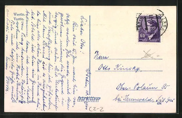 Personenbezogene Daten auf der Rückseite der Karte wurden durch blauen Textmarker unkenntlich gemacht. Die blauen Stellen sind auf die Vorderseite durchgeweicht und wirken sich negativ auf das Postkartenfoto aus