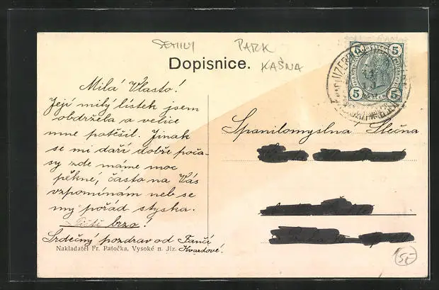 Personenbezogene Daten auf der Rückseite der Karte wurden durch blauen Textmarker unkenntlich gemacht. Die blauen Stellen sind auf die Vorderseite durchgeweicht und wirken sich negativ auf das Postkartenfoto aus