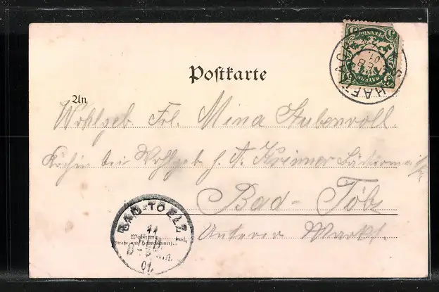 Personenbezogene Daten auf der Rückseite der Karte wurden durch blauen Textmarker unkenntlich gemacht. Die blauen Stellen sind auf die Vorderseite durchgeweicht und wirken sich negativ auf das Postkartenfoto aus