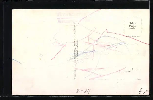 Personenbezogene Daten auf der Rückseite der Karte wurden durch blauen Textmarker unkenntlich gemacht. Die blauen Stellen sind auf die Vorderseite durchgeweicht und wirken sich negativ auf das Postkartenfoto aus